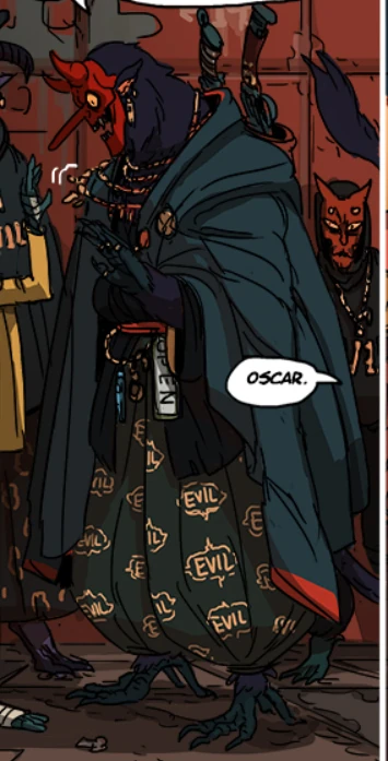 Dhuutholmel,[1], also known as Oscar,[2] is a crimson devil and the grandson of Vladok[3] (in a spiritual sense)[4] and the ex-boyfriend of Cio[5] from a time before she was a blue devil.[1] He runs a gang known as Badstar, based in the Lower Shades.[6] When Allison and Cio begin preparations to break into the Fortress of Yre, Oscar is the one who finds an assortment of devils to help with the heist and provides armor for Allison to wear. He seems pleased to see Cio acting more like her old self.[7]